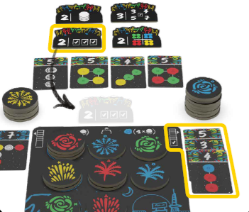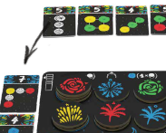 色でポイントを獲得した花火タイルから、その種類でもポイントを獲得することができます。ボードの色および種類のスコアリングにおいて、覆われた花火タイルからはポイントを獲得できません。