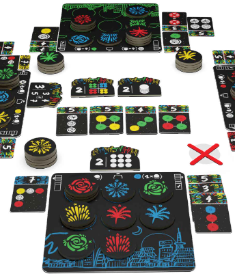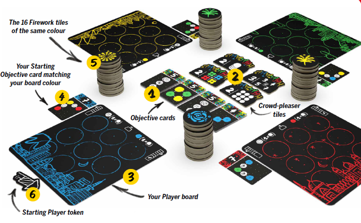 あなたのプレイヤーボードにタイルを配置して、ゲーム終了時に最も多くのポイントを獲得する花火大会を作成します。これらのポイントは、個々の目標の達成、観衆を歓喜させること、そしてあなたの色と種類の花火を通じて獲得できます!