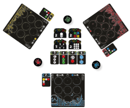 4) プレイヤーボードと同じ色の1枚の両面印刷の開始目標カード。使用する面を選択します。