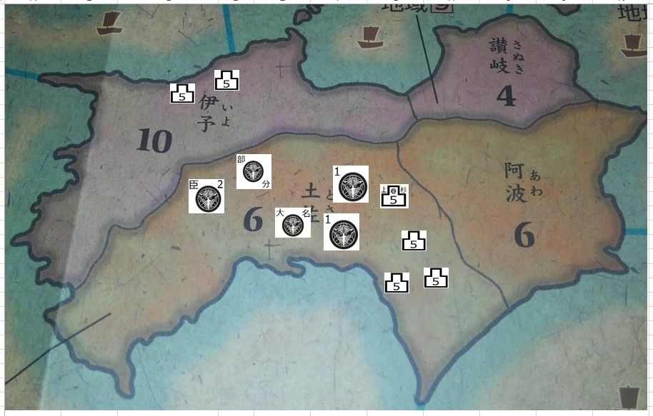ソロプレイ用の「四国統一」のリプレイです(現物ありのオンセでのプレイのため、エクセルで操作しています。家紋が違うのはお許しください)