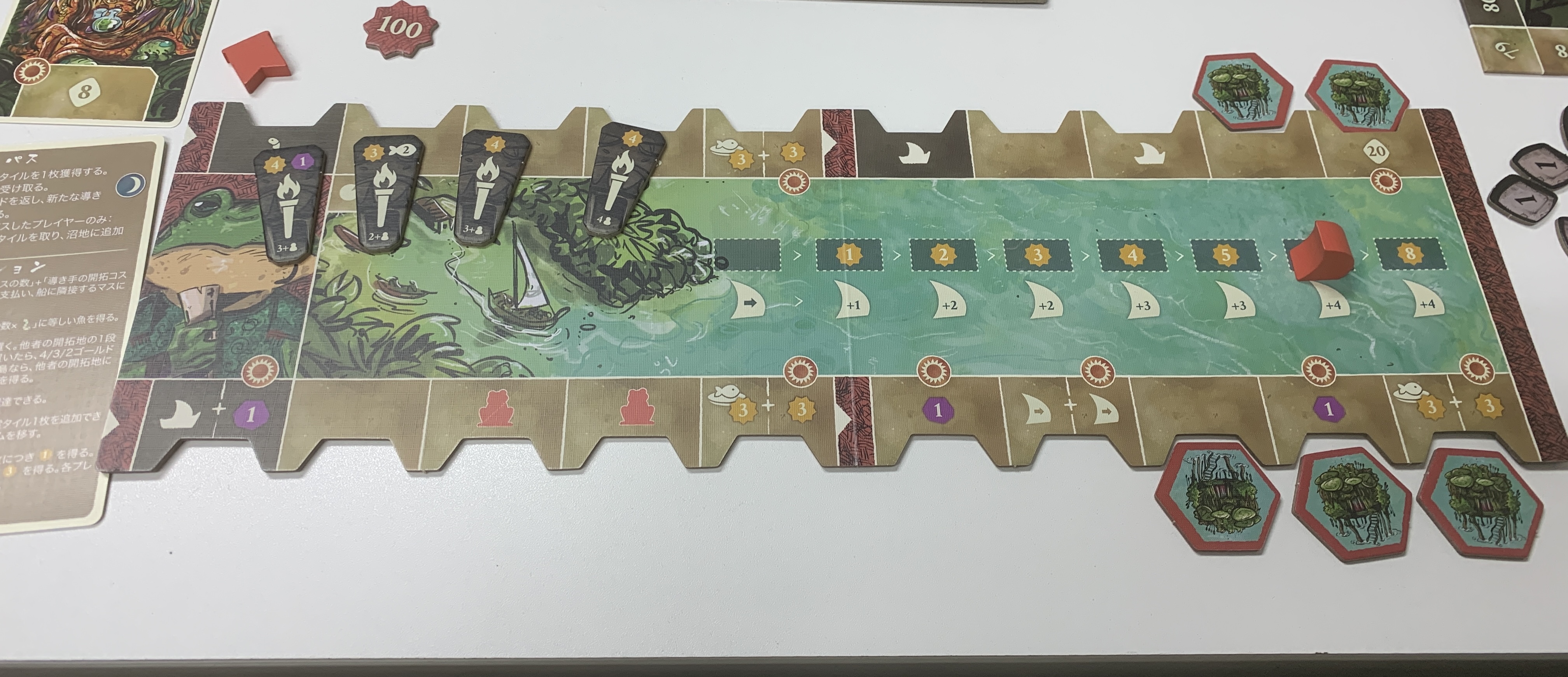 水辺の部族というテーマだけあり、氏族がワニ、カメ、カエル、サンショウオと、あまり見かけない生き物になっています。特にサンショウオが登場するボードゲームは、軽量級を含めても記憶になく、新鮮に感じました。