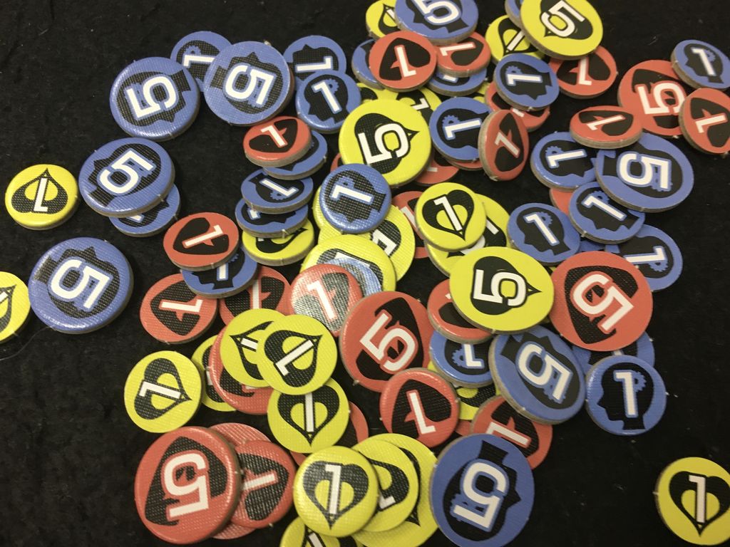 ゲーム中の能力値は、ゲーム中の各判定結果なのによって減少していきますが、専用の《コマ(カウンター)》が用意されており、これをやり取りすることで数値の管理が可能です。