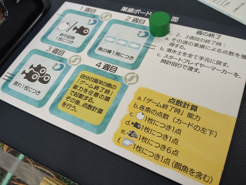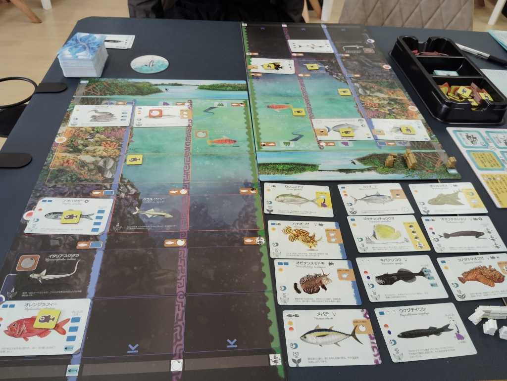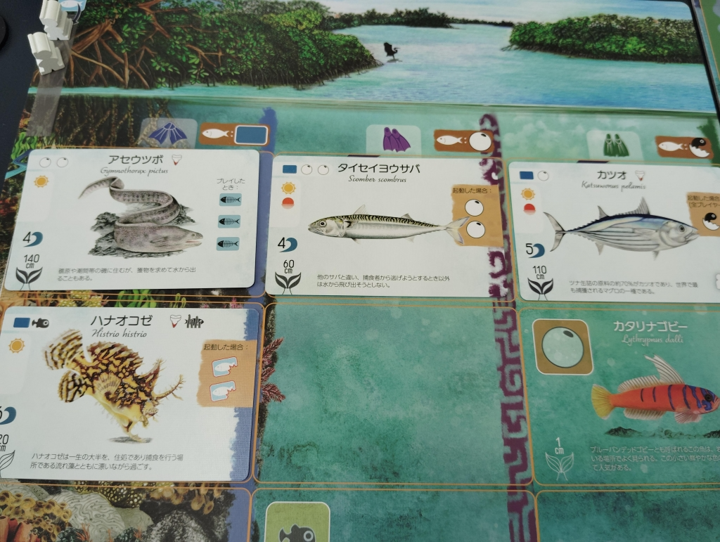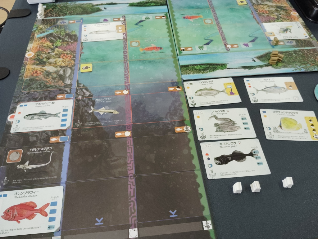 遊んでみまして、魚の住む場所が浅瀬から深海まであるからか個人ボードが縦長で2人でもなかなかにスペースは使いました。