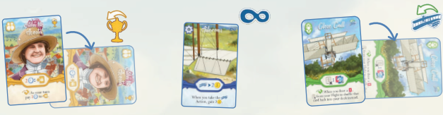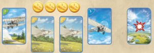 各自デッキを構築し、飛行(フライト)アクションではデッキから1枚ずつめくっていきます。カードの数字の合計が飛距離となりますが、問題アイコン(爆発マーク)が4つ出てしまうと墜落です!それなら3つまで引いて止めれば良いだけかと言うとそう単純ではなく、空中にいるのですから降下を始めてから着陸するまでに追加でもう2枚引かなければなりません!しかも、飛行中は色々な能力を使ってデッキを操作したりできるのですが、降下中は一切の操作ができず、完全に運を天に任せるしかありません。墜落した場合、怪我をしたパイロットの回復に時間を要しますが、記録はちゃんと残ります。