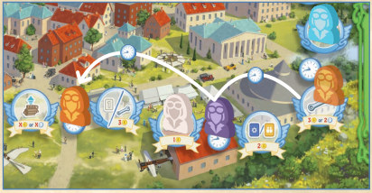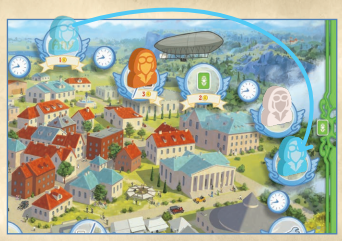 メインとなるアクション選択方法は、パッチワークや東海道などで採用されている時間トラックです。トラックの最後尾にいるプレイヤーの手番となり、好きなだけ前に進んで止まったマスのアクションを行います。