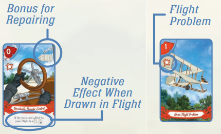 テスト飛行を行い、デッキから引くことで初めて欠陥の内容が明らかになります。フライトの後、引いた欠陥カードはガレージにキープしておきます。