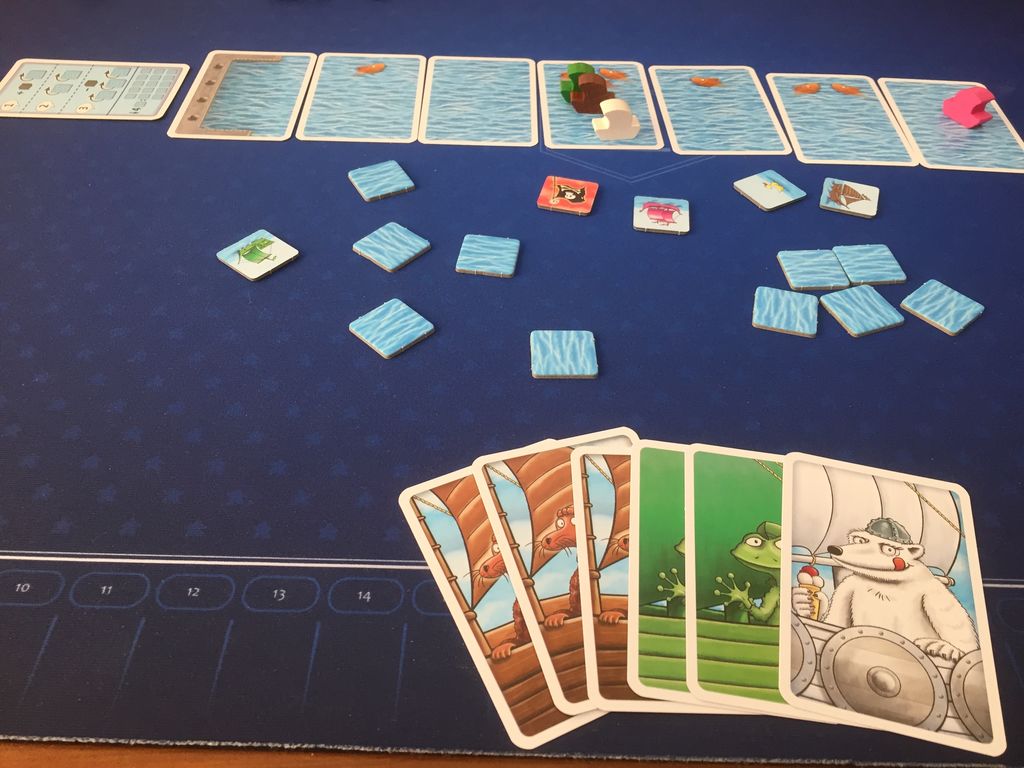 タイルを裏向けて置き、船をすべて港に置いて、カードを配り切ったら、ゲームスタートです。