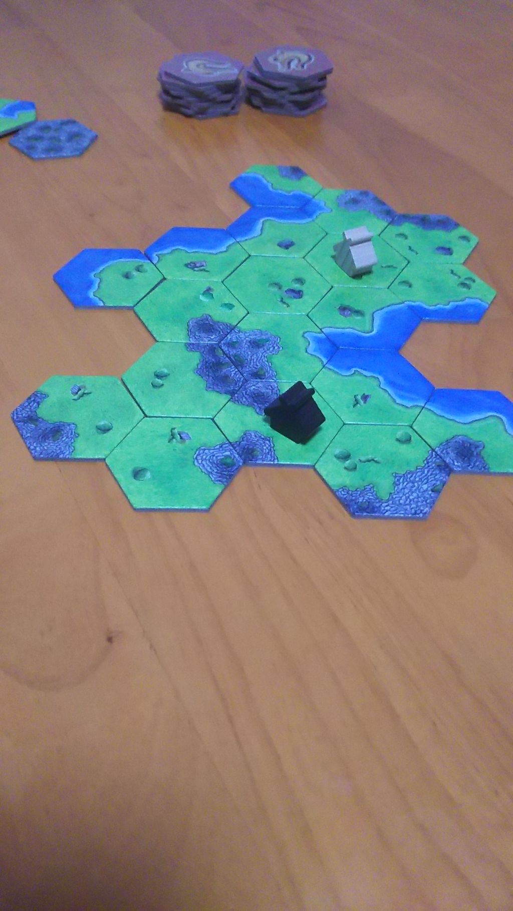 二人で3ラウンドの決戦。タイルの配置条件が細かいですが とりあえず地形作りを行い適所に拠点の家コマをおく配置ラウンドと拠点からの陣取りしていく得点ラウンドに別れる。このセットを三回行い得点が多い方が勝ち。もし引き分けなら2回勝った方が勝ち。二回負けても総得点が多ければ勝てる3ラウンドの死闘。