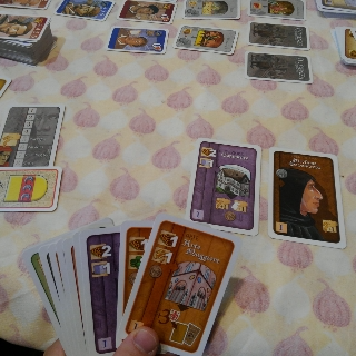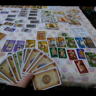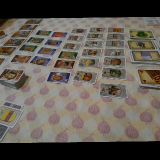 カードがいっぱい並んだりしましたけど、ゲームのほうはアクションカードを選択して、資材を獲得したり手札や場にある建物カードや資材生産カード、人物カードを資材を支払い建設したり雇用するって分かりやすい。