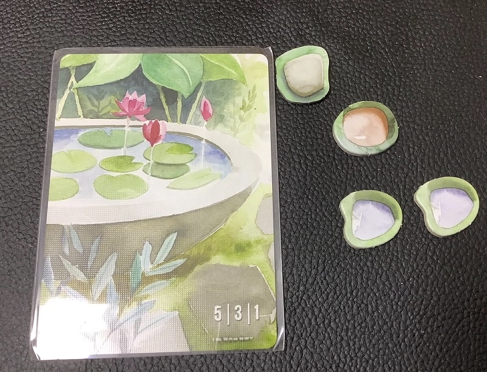 それぞれ手に入れたカードの場所の上から順に手番が処理されていきます。1列目で一番手を取りたいが目の前にはなにがあるのかわからないカード、2列目は普通のカードが並ぶ、3番目の列は時折石ころトークンがまばらに置かれ、4列目は石ころトークンが敷き詰められています。