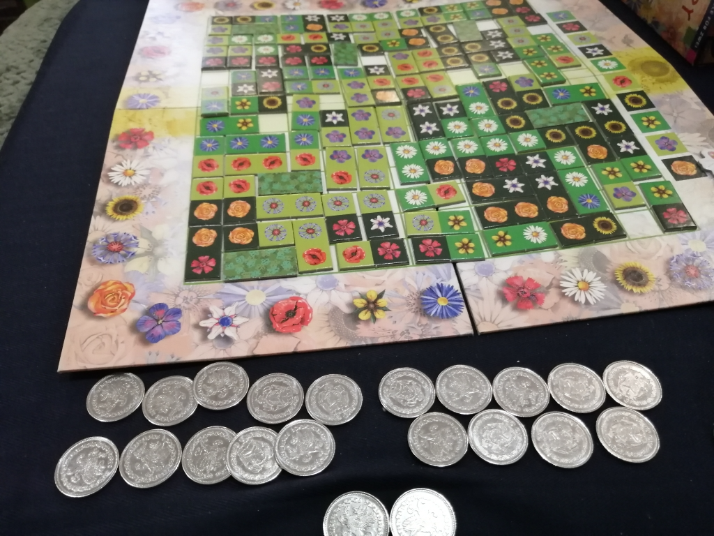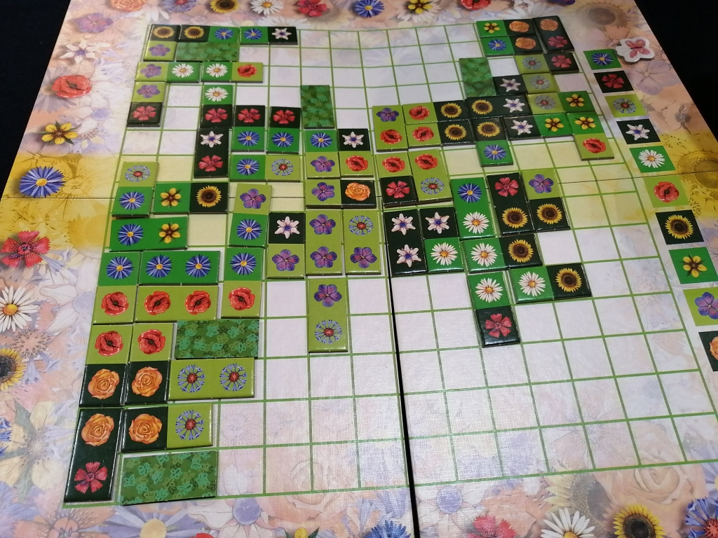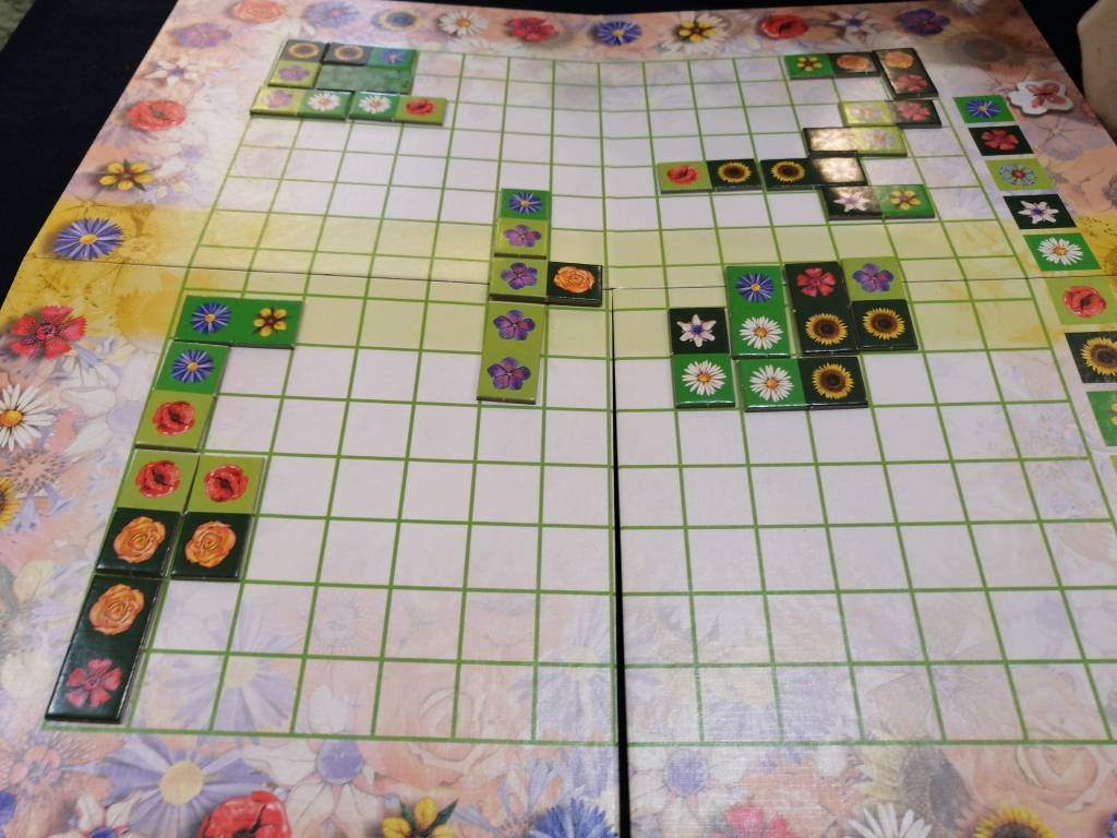 中立エリアにある花は、繋がると得点計算に含まれますが相手も繋がっていると自分のエリアにある繋がっている花の数が多いほうが得点になります。タイル配置ゲームとして遊びやすかったですかね。