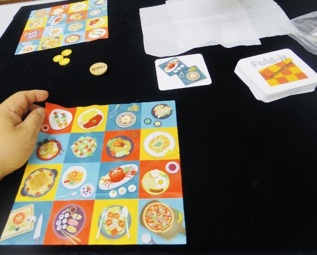 両面同じ絵のハンカチ(布)を折り畳み誰よりも早くお題達成を目指す