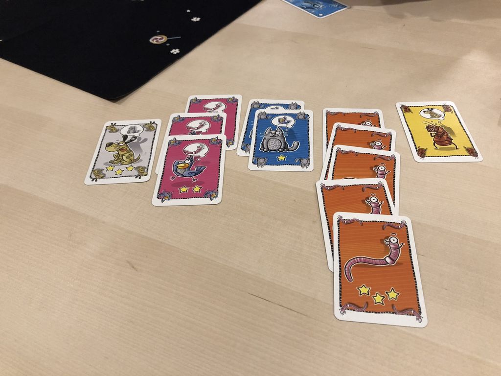 また、場にミミズ1枚、鳥1枚、猫2枚が出た場合には、スタートプレイヤーから時計回りに近いプレイヤーが貓1枚、鳥1枚、ミミズ1枚を取ることになり、スタートプレイヤーから遠いプレイヤーは何も取れない結果となります。