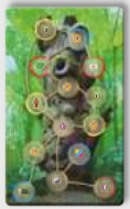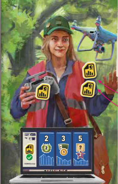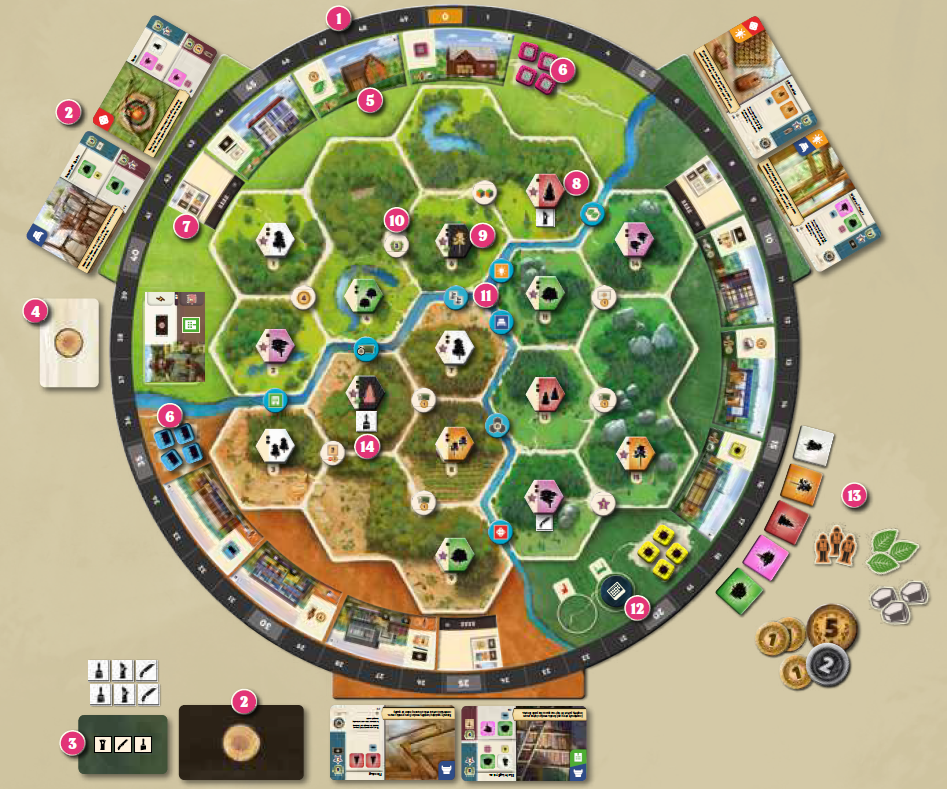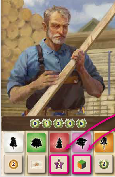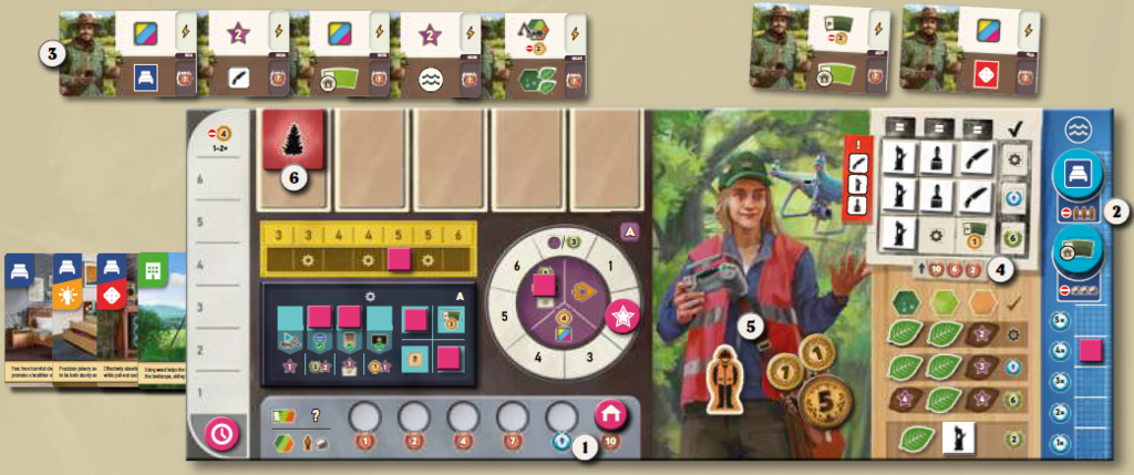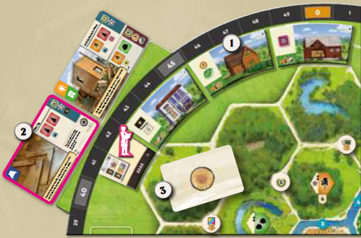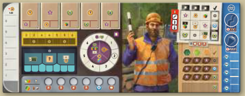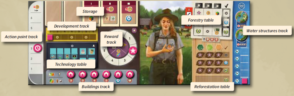 プレイヤーボードの右半分は、林業活動と森林管理を表しています。右上には林業テーブルがあり、プレイヤーは森の世話をすることで獲得した林業家トークンを徐々に配置し、さまざまなボーナスを提供します。