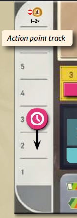 各プレイヤーは、3アクションポイントを持ってゲームを開始し、アクションポイントはプレイヤーボードの左側で追跡されます。