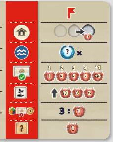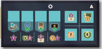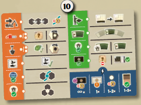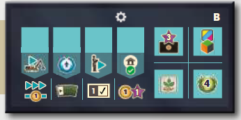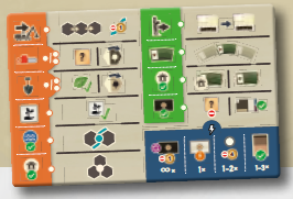 ゲーム全体を通して、プレイヤーはプレイヤーボードを使用して、アクション、リソース、その他のゲーム要素を追跡します。いくつかのセクションに分かれており、それぞれに独自の目的があります。