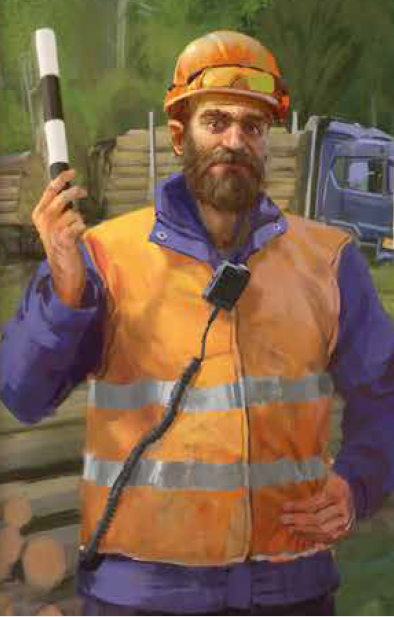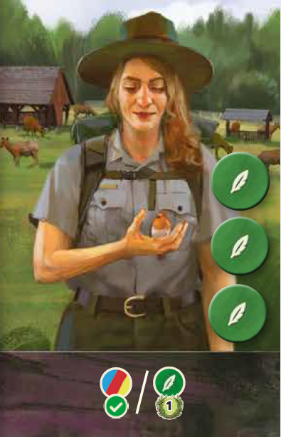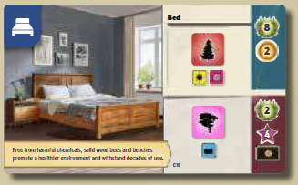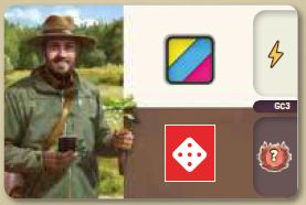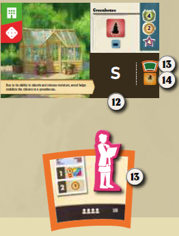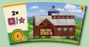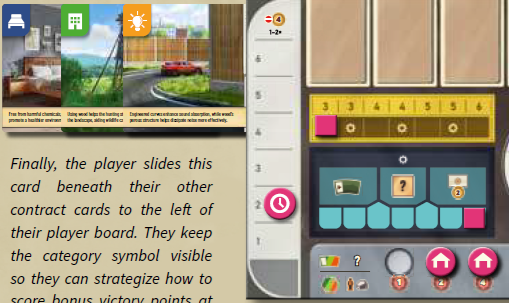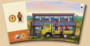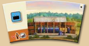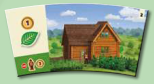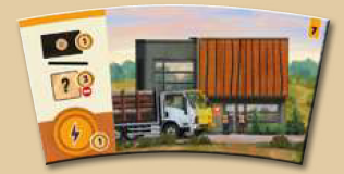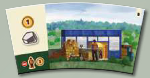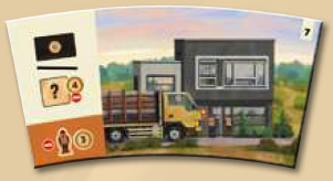 12. ランダムな開始契約カード1枚を受け取り、プレイヤーボードの右側に置きます。 13. 3つのHQタイルのうち、開始契約の色に一致するタイルに製材所管理者トークンを配置します。 14. 開始契約カードに示されている木材トークンを、空いているストレージスペースの1つに配置します。 |