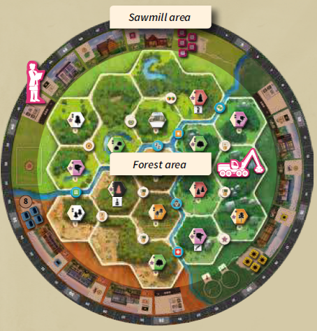 製材所エリアはゲームボードの外輪にあります。各プレイヤーの製材所管理者トークンが配置されるHQタイルと製材所の建物タイルで特徴付けられます。