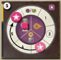 12. 10枚のラウンドトークンを裏向きにランダムな順序でスタックを作成し、緑色の開始アイコンが付いたラウンドスロットに置きます。