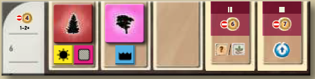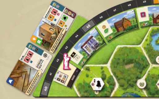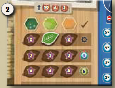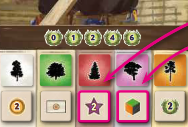 その下は植林テーブルで、プレイヤーは苗木を配置し、ボーナスとして報酬トラックを進めます。