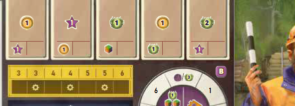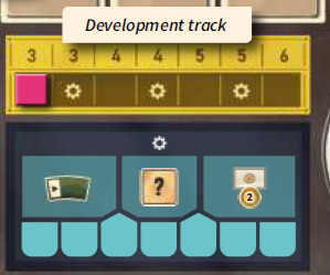 左側の中央には、ゲーム全体の中心があります。開発トラックは、アクションポイント数を決定し、テクノロジータイルに強調表示されているテクノロジーをアクティブにします。その近くには円形の報酬トラックがあり、プレイヤーはゲーム全体を通してそれを進めていきます。