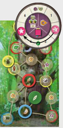 15. 最後に木に触れたプレイヤーがファーストプレイヤーとなり、ファーストプレイヤートークンをプレイヤーボードに置きます。プレイは時計回りに進行します。