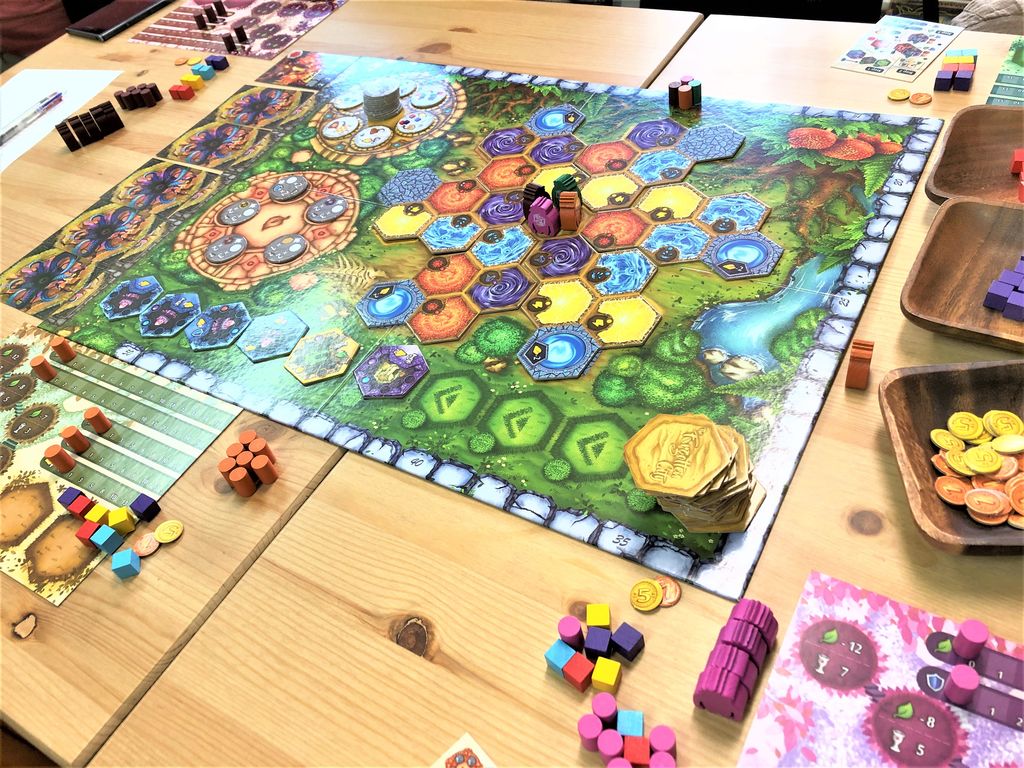 日本語ルールを素読みでゲームをしましたが、問題なく遊ぶことができました。シンプルですが、明るくてカラフルな盤面で、エリアをうまくコントロールする力が求められる、先の見通しが大事な、良い中量級ゲームだと思います。