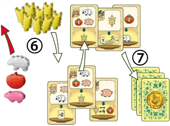 6) 3枚目のトレードカードも履行し、トマト1つ、羊1つ、豚1つを支払います。次に、サプライから小麦を8つ取り出します。 7) 最後に、履行した3枚のカードを裏向きにしてあなたの前に置き、マーケットを5枚のカードになるように補充します。 |