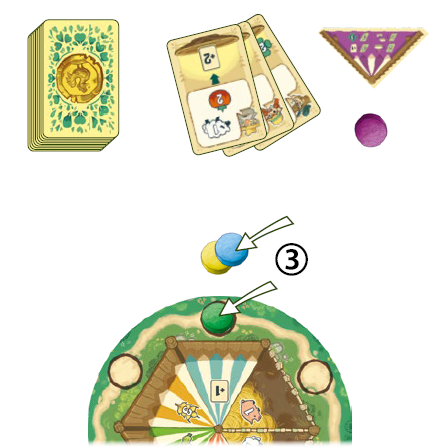 3) あなたのディスクと概要タイルを選択し、残りのディスクの1枚を「カウントダウン」ディスクとして補給スペース[+1カード]の円に置き、残りのディスクの2枚を補給ボードの横にスタックします。 |