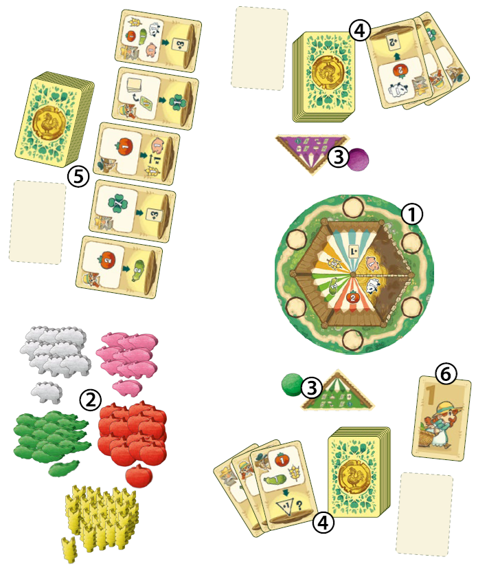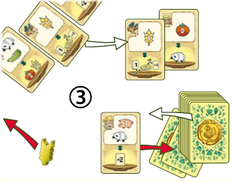 畑作物を取る: 補給スペースに印刷されている種類の畑作物を指定された数だけ取り、あなたの前に置きます: 小麦3、キュウリ2、トマト2、羊1、または豚1。 畑作物はいくつでもあなたの前に集めることができます。 |