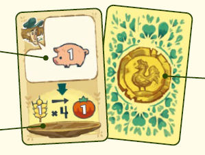 コスト: トレードカードの上部には、トレードカードを履行するためにすべて支払う必要があるコストが表示されます。ほとんどのカードでは、小麦、キュウリ、トマト、羊、豚など、畑作物を1つ以上支払い、サプライに戻す必要があります。いくつかのカードには特別なコストがあり、このルールブックレットの裏ページにある用語集で説明しています。
