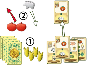 1) あなたのターン開始時、トマト2つ、小麦4つ、手札にトレードカード4枚を持っています。ルールブレイカーに使用できる履行済みトレードカードは4枚あります。 2) 手札から最初のトレードカードを履行し、トマト2つを支払い、報酬としてサプライから羊1つを取ります。 |