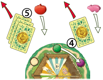4) ここで、物資を入手します。豚1つの補給スペースにあなたのディスクを移動し、すでに別のディスク1枚が配置されているため、履行済みのトレードカード1枚を支払います。次に、サプライから豚1つを取り出します。 5) さらに、残りの3枚の履行済みトレードカードを支払い、サプライからトマト1つを取り出します。 |