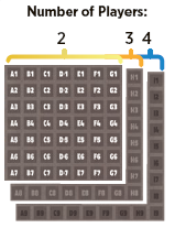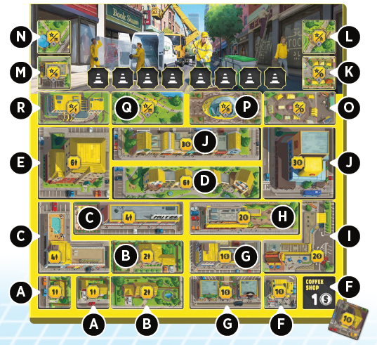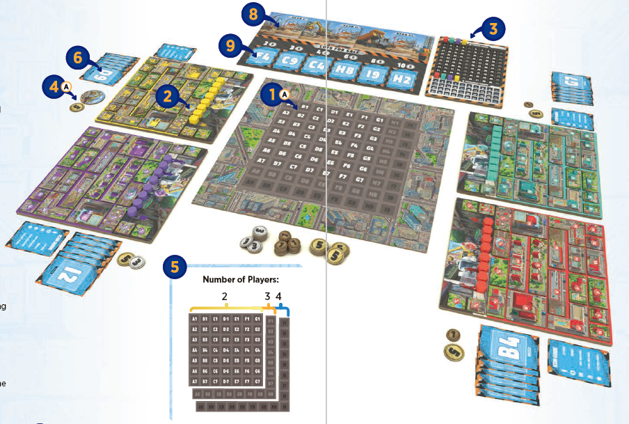 4人のプレイヤーでプレイする場合、81の区画(列A-Iと行1-9)を使用して9x9の都市ボード全体でプレイします。より少ないプレイヤーでプレイすると、都市ボードの使用面積が小さくなり、区画の特定の行または列を使用しなくなります。プレイヤーの数に応じて、証書カードの一部をゲームから除外する必要があります。