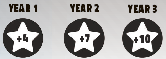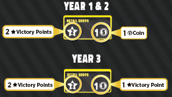 Year 3の最終スコアリングでは、プレイヤーは商業施設のコインの代わりに、同じ数だけボーナス名声を獲得します(印刷された名声に加えて)。例えば、最終年の小売店は合計3名声の価値があります。 |