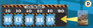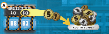 例 黄プレイヤーは、区画B2が売りに出されているのを見て、それを買いたいと思っています。 (A)黄は6コインをサプライに支払います。 |