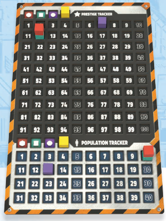 スコアボードの指定されたスペースに、プレイヤーの色と一致するスコアキューブを2つ配置します(1つは名声トラッカーに、もう1つは人口トラッカーに)。