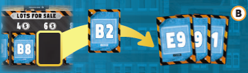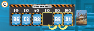 各プレイヤーは同時に、手札から1枚の証書カードを選び、それを目の前のテーブルに裏向きに置きます。すべてのプレイヤーがカードを選択したら、プレイヤーは同時にカードを表向きにして選択した内容を公開します。次に、公開された区画に区画マーカーを配置し、証書カードを自分の山に追加します。