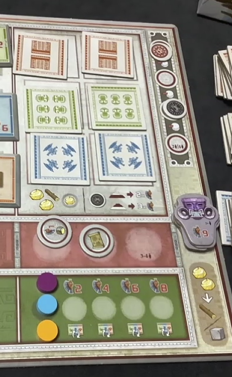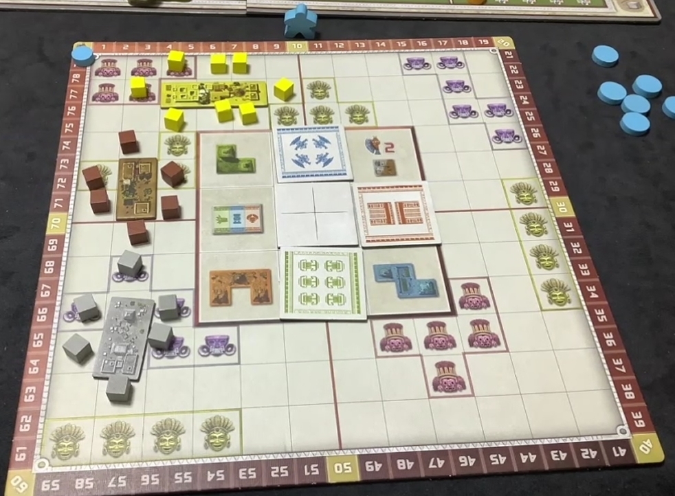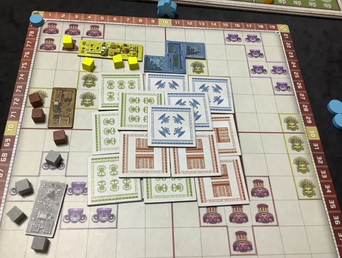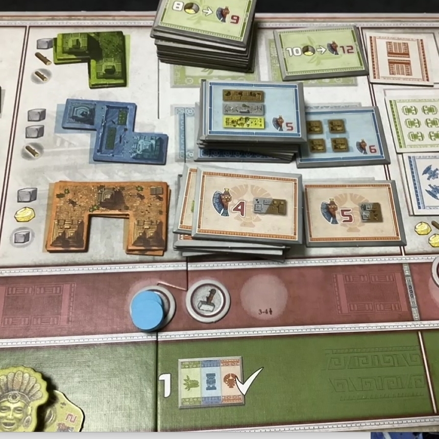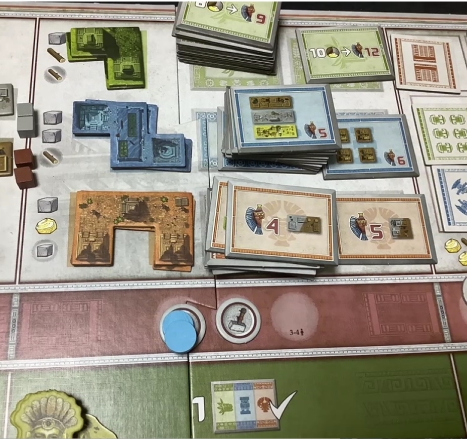 ラウンドごとに減らされるパワートークン、そしていうことの聞かない建築士と3人でやったら4ラウンド目がないという仕様、ちなみに建物タイルやピラミッドタイルは毎ラウンド1枚か2枚しかありません。