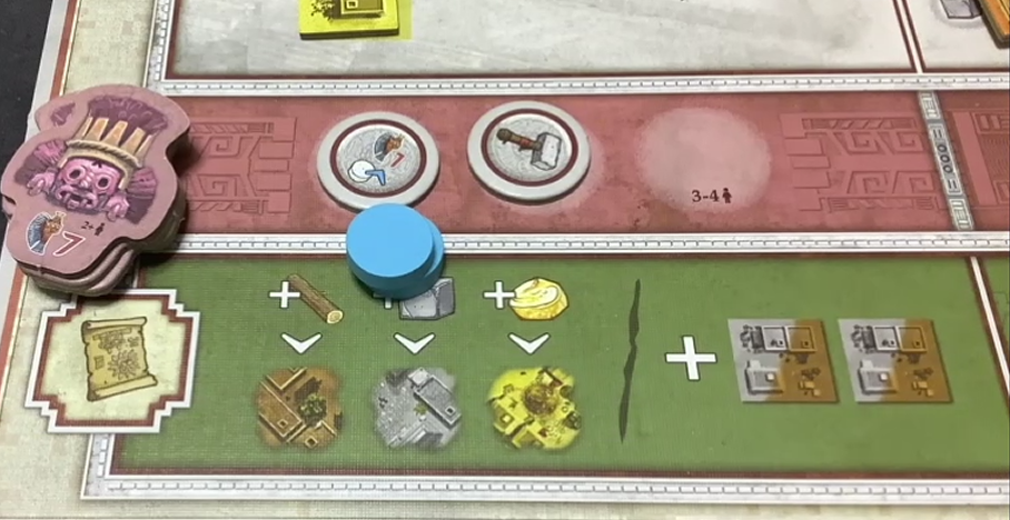 ここは神殿を建築するアクションとなります。各タイルの左に必要資源が書かれていますが下の灰色に囲まれた資源は、パワーが足りなかった場合、足りない分その資源の個数支払うことでまかなえるという意味です。