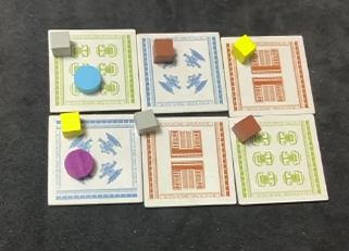 これが初期盤面になります。プレイ人数や手番順によって上にある建築士ゴマ(ミープル)の位置が変わります。