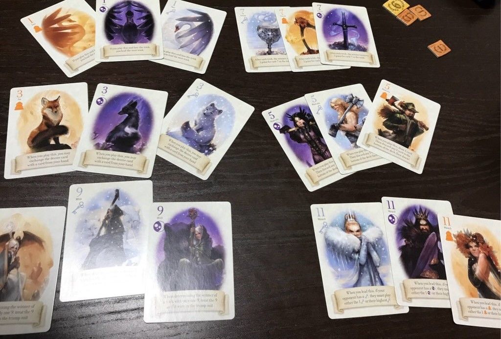 ルールは一般的なトリックテイキングですが、偶数の札に特殊能力があるのが特徴です。また、2人用で使わないカードも一部あるのですが、基本的に自分が持っていないものは相手が持っていると考え、カードがプレイされるたびに暗記をしなおす必要があります。