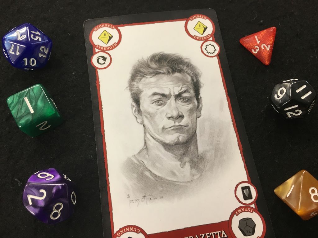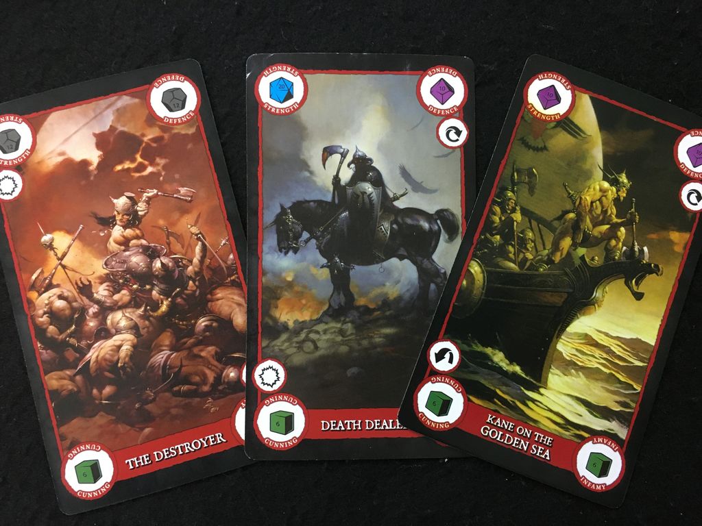 各カードにはそれぞれ4つのパラメータが設定されており、「Strength」(筋力)「Defense」(防御力)「Cunning」(ずるがしこさ)「Infamy」(不名誉、汚名)に、それぞれ色分けされたダイスの絵が描いてあります。