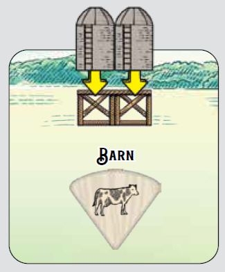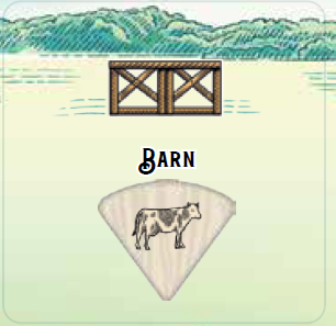 • 建物は、建物能力の左側のスペースに置きます。 • 家畜は牧草地に置きます。 • フルーツはバスケットに入れます。 • 注文カードはプレイヤーボードの左側に表向きに並べます。 |