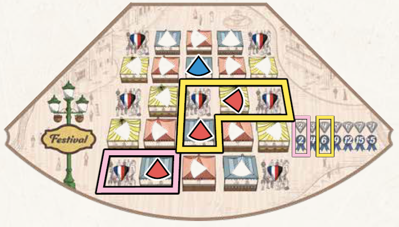 あなた(赤プレイヤー)は、チーズトークン4つのグループから6ポイント、チーズトークン2つのグループから2ポイントを獲得します。 あなたのスコアは6 + 2 = 8名声ポイントです。 |