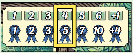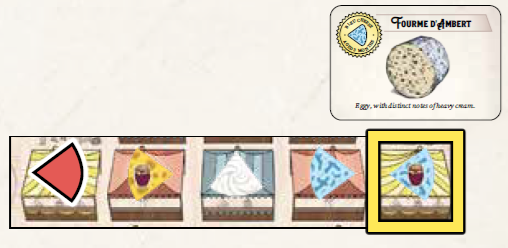 ゲーム終了時に、あなたのチーズトークンが1つでも置いてある異なる棚の数を数え、ボード上の得点表を参照して名声を獲得します。看板にポイントボーナスのある棚に置かれたあなたのチーズトークンごとに、指定されたポイントを追加します。
