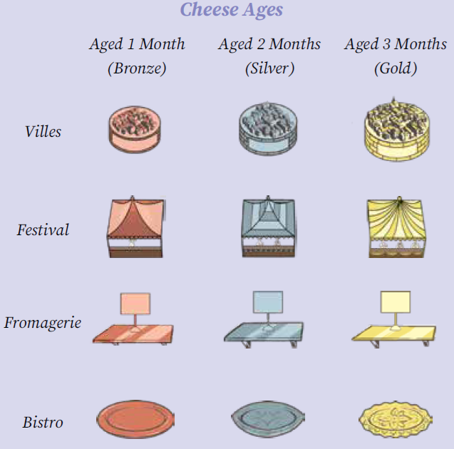 各チーズスペースには熟成期間も指定されています。熟成期間が長いチーズを作ることはより価値がありますが、そのワーカーが再び利用可能になるまでに長く待たなければならないというコストがかかります。ブロンズスペースのチーズは1ターンで完全に熟成し、シルバーは2ターン、ゴールドは3ターンかかります。ブロンズ、シルバー、ゴールドのスペースの特典は、会場によって異なります(4つの会場については、8-9ページで説明します)。