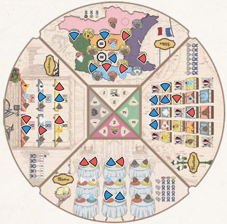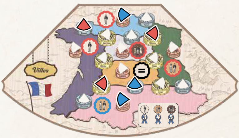 あなた(赤プレイヤー)は、紫、青、白、緑のエリアで最も多くのチーズを置いているので、それらのエリアから顧客トークンを取ります。 オレンジのエリアでは、チーズの数が青プレイヤーと同数最多でした。 あなたは3 + 3 + 4 + 5 + 0 = 15名声ポイントを獲得します。 |