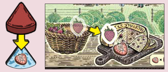 一部のチーズスペースには、フルーツまたはジャムのアイコンがあります。これらのチーズを作るには、フルーツトークンを使用する必要があります(フルーツについては10ページで説明します)。