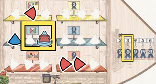 ゲーム終了時、あなたのチーズトークンは3つの異なる棚にあり、5ポイントに相当します。さらに右下の棚のあなたのチーズトークンごとに1ポイントを獲得します。 あなたは5 + 1 + 1 = 7名声ポイントを獲得します。 |